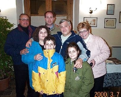 left to right / da sinistra a destra: Al Porreca, Lamberto Badia, Pierangela Badia, Leonardo (marito di Pierangela), Lee Porreca, davanti i due figli più piccoli di Leonardo e Piera, in una pizzeria di L'Aquila, marzo 2000?