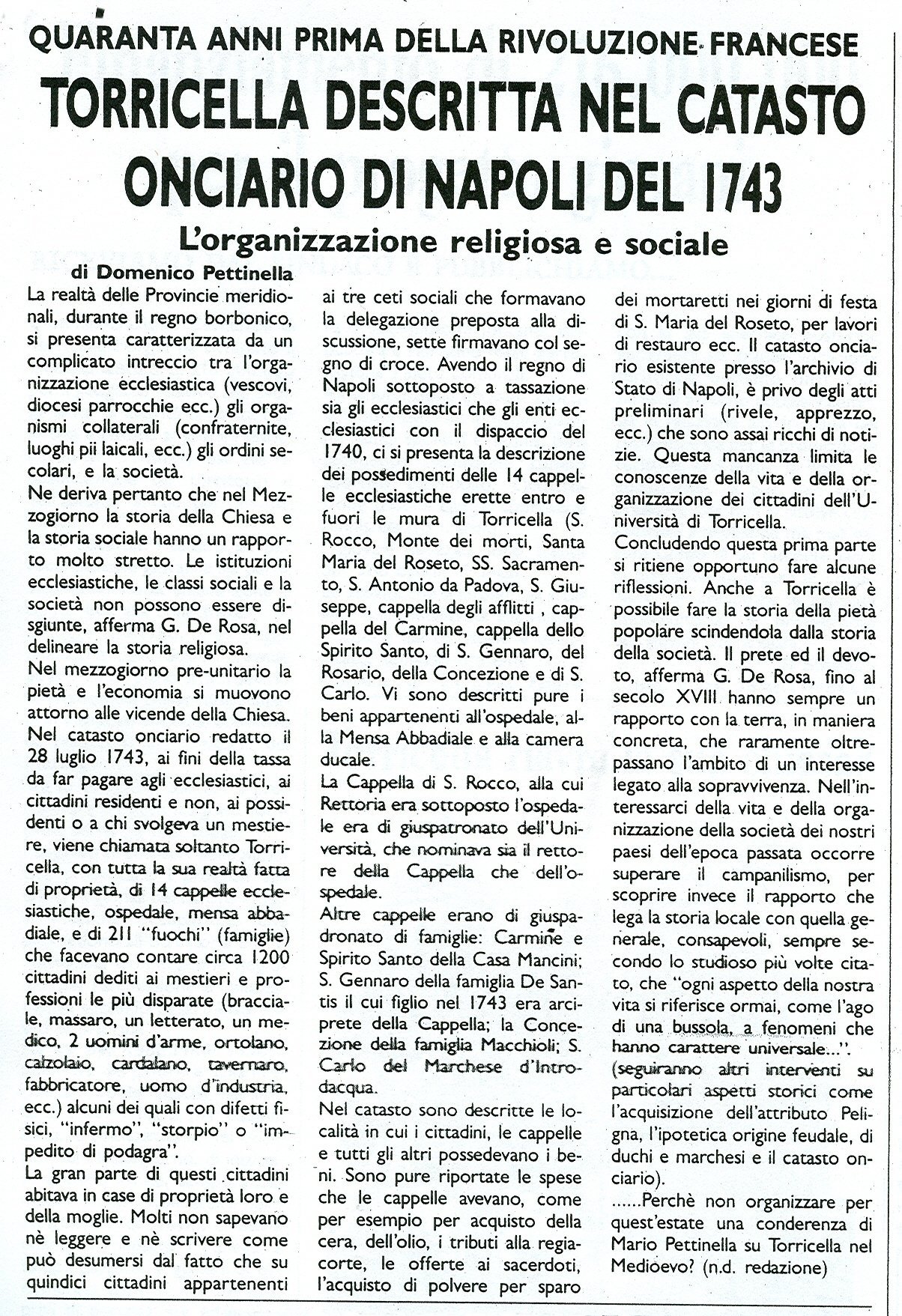 TORRICELLA DESCRITTA NEL CATASTO ONCIARIO DI NAPOLI DEL 1743