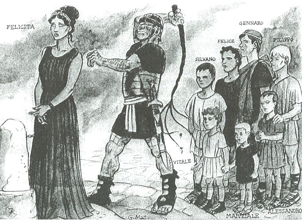 If you ask around, however, the doubts and the questions soon emerge. The Patron Saint of Torricella was a child: he was just seven years old and he lived in the times of Marcus Aurelius[2] Was the Patron Saint really a child of seven? Is that possible? What could have made a tot of that age be of such importance, meriting that he become a Saint and even a martyr[3]? Many generations of Torricellans have asked themselves such questions, not hiding their perplexity and reserve, so much so that they have often said, "Our Patron Saint is "scompicciato" ("messed up"), in other words, "he wets himself": a frank, knowledgeable expression, alluding to the Saint’s young age. Yet Marziale, youngest of seven children, despite his young age, together with his mother Felicità[4] and all his brothers (Gennaro, Filippo, Felice, Silvano, Alessandro and Vitale[5]), faced a trial at which they were accused of being Christians. Before judgement and conviction, (the accusers) repeatedly tried first with promises, blackmail and threats and then with torture and beatings/whippings, to induce them to renounce the religion in which they believed. According to the authorities, this religion undermined the order of the state and upset the entire hierarchy of the values upon which the ideologies of the time were based. Imagine this scene: a Roman mother, (Felicità, a noblewoman, it seems[6], belonging to the "gens Claudia[7]" the Claudian family) stands before the magistrates, surrounded by her seven sons, all of them very young. If you want to let your imagination run wild, think about this taking place in the small theatre at Juvanum. The shouting restless crowd is crammed, packed onto the steps. Some magistrates[8], armed with cuirass[9], helmets and spears, with a fierce and steely air, surround and watch over the accused. Instead the Prefect[10], who presides over the trial, is seated at the centre of the semicircle, on a high stool, swamped by a rich purple toga; in front of him is enthroned the marble image of Marcus Aurelius; a flame in a tripod burns at the base of the statue. "The Emperor’s statue," the Prefect insinuates blandly, "has been put here before us with a sacred flame burning at its feet. It will suffice if you put a grain of incense into the tripod, to show that you repudiate Christianity." You don’t even need to speak. Then you can happily return home from here….." Surrounded by her seven sons, and holding the two youngest, Vitale and Marziale, tightly to her, Felicità smiles sadly, and looks at the Prefect with commiseration. Then she turns her eyes towards heaven and stands still, silent, as if in prayer, not deigning to reply to her inquisitor. "If you insist in being silent," the Prefect hisses at her, barely holding back his irritation and impatience, "I shall be forced to have you tortured: you first and then, if you do not abjure your insensate creed, your children too …… including that little boy you are clutching as if to protect him." Felicità feels a pang of anguish run through her. The thought that her