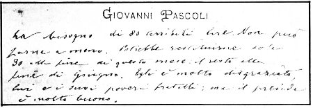 Giovanni Pascoli needs 80 terrible liras. He cannot manage without them. He could repay only 30 at the beginning of this month: the rest at the end of June. He is very wretched, him and his poor brothers: but the Headmaster is very good. Endnotes from Translator: