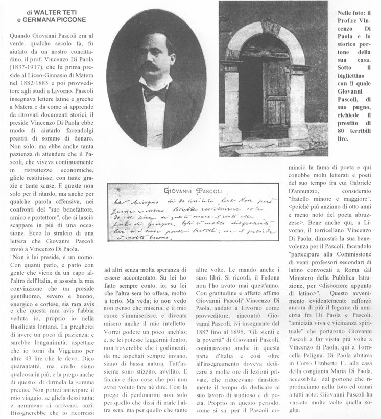 Giovanni Pascoli (1855 – 1912), Poeta’ Italiano. A 12 anni perse il padre in un assassinio; a questo lutto si seguivano la morte della madre che influenzo profondamente la sua vita, la sua visione del mondo e la sua poetica; e di cinque dei frattelli e sorelle. A Bologna, dopo la laurea, si avvicinò a gruppi anarchici e socialisti ma, in seguito ad una esperienza di carcere(1879) che lo segnò in maniera pesante, abbandonò la politica attiva. Decise di dedicarsi all'insegnamento universitario e succedette Giosue’ Carducci come professore di lettere a Bologna nel 1905; ma non tralasciava mai, però, la sua unica passione: la poesia. La sua produzione poetica, vasta ed eclettica, consistette in un incessante sforzo di ricerca metrica e formale l’ha vinto fama internazionale; imperniata su temi vari, quali: il gusto per le piccole cose, viste con gli occhi di un bambino; il torbido, il nascosto; l'ansioso bisogno di quiete, di un "nido" sereno di affetti; il simbolismo; la celebrazione, propria delle sue ultime opere. Straordinario erudito, capace, nella sua costante opera di rinnovamento, di frantumare il discorso letterario in fugaci impressioni, affascinato dai temi della classicità nei suoi momenti di decadenza (tanto da comporre i "Carmina" in lingua latina).