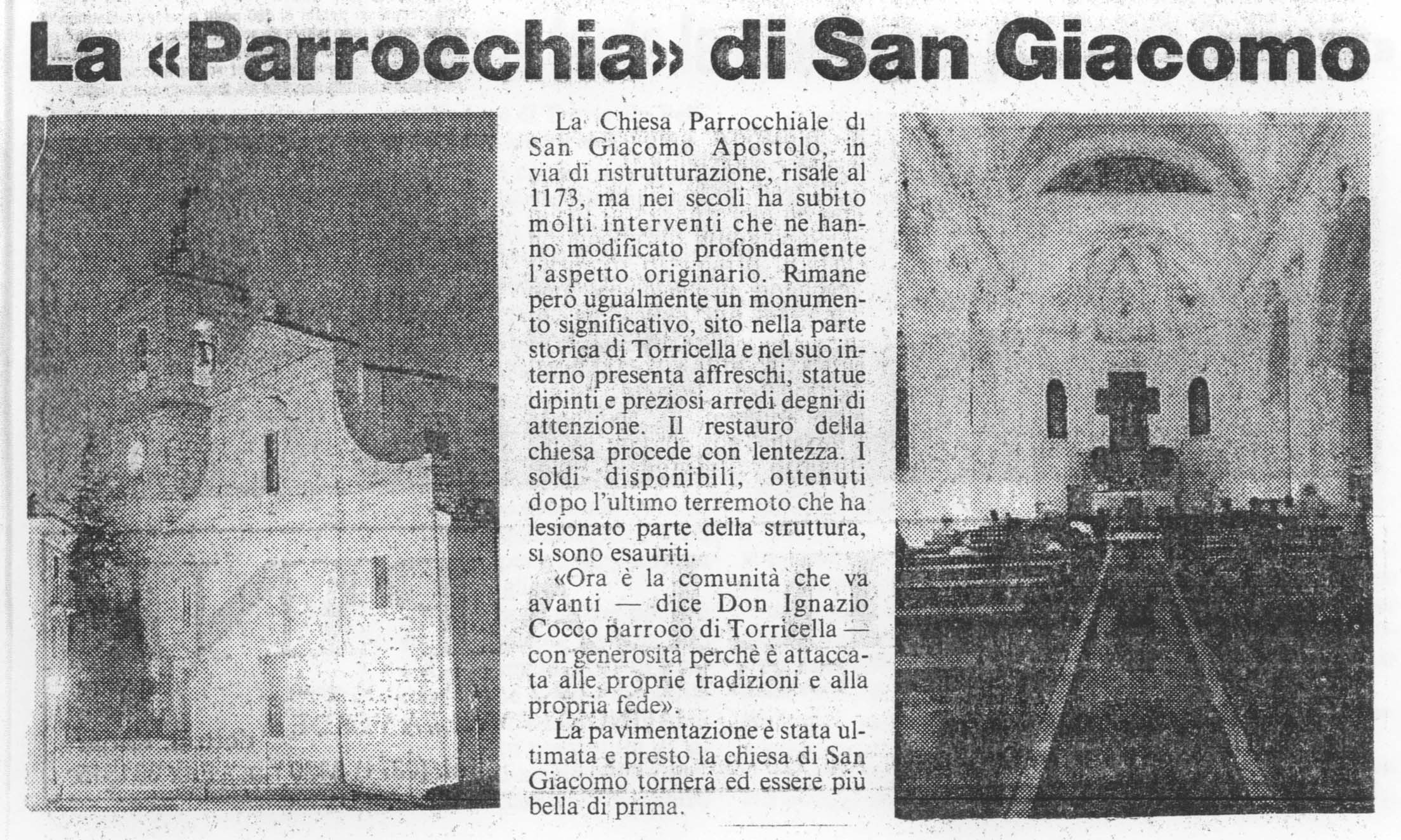 The parish church of San Giacomo Apostolo, under restoration, dates back to 1173, but over the centuries it has undergone many modifications that have deeply altered the orginal structure. It is nonetheless an important monument, located in the historical section of Torricella; inside, it features frescoes, statues, paintings and precious fittings worthy of attention. The restoration of the church proceeds slowly. The available funds obtained after the last earthquake that has damaged part of the structure, are exhausted. “Now it is the community that lives on”, affirms Don Ignazio, “with generosity because it is attached to its own traditions and its own faith.” The paving has been completed and soon the church of San Giacomo will be even more beautiful than in the past.