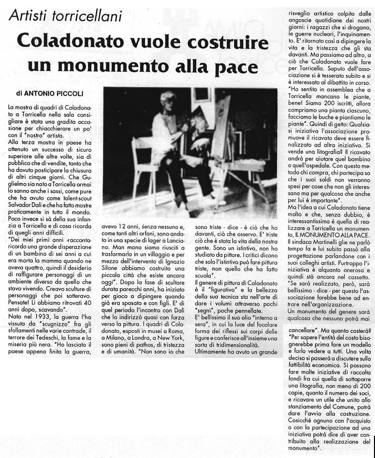 Torricellan Artists Coladonato wants to build a monument to peace by Antonio Piccoli. The exhibition of Coladonato’s paintings in the Council Room at Torricella provided a welcome chance to chat with “our” artist. This, his third exhibition in our village, was even more successful than his others both with regard to the public and for sales, so much so that he had to defer closing it for an extra five days. That Guglielmo was born in Torricella is known by now to everyone (even the stones), as also are the facts that the Talent-Scout who spotted him was Salvador Dali, and that he has been exhibited almost all over the world. On the other hand little is known about his childhood in Torricella or what he remembers about those difficult years. He relates, “Of my early years I remember feeling great desperation as a child of six, for my mother had died when I was only four years old, and so I wanted to portray people from a different life than the one in which I was living. I created sculptures of people, but I buried them. Just think of that! We found them again 40 years later by digging them up. Born in 1933, he went through the war as an “urchin” (scugnizzo), amongst the evacuees (refugees) in various zones in the countryside, living in fear of the Germans, amidst hunger and deepest gloom. “I left the village almost as soon as the War was over, when I was 12, all alone and, like so many other orphans, I went to a sort of a lager[1] at Lanciano. Gradually we managed to transform it into a village and thanks to the help of Ignazio Silone we built a small City which is still there to this day.” After his early phase as a sculptor, which lasted a good number of years, when he was married and had children, he started to paint for fun. That was the period in which he met Salvador Dali who almost forced him onto becoming an artist. Coladonato’s paintings on display at Art Galleries in Milan, London and New York, are full of pathos, sadness and humanity. “I am not unhappy,” he said, “it’s what is in front of me, what I observe, our people’s lives are sad. I am spontaneous, I have not studied art. The critics say that only spontaneity allows one to depict sadness, not what has been taught in school.” Most of Coladonato’s paintings are “figurative” (symbolic) and the beauty of his technique lies in the art of portraying volumes with few “indicators” and few brush strokes. His oil painting “Interior in the Evening” (interno a sera) is very beautiful, with light from the fire forming reflections on the people’s bodies, conferring a sort of three-dimensional effect. Lately he had a great artistic re-awakening, struck by the daily anguish of present times: children who take drugs, nuclear wars and pollution. So he went back to painting life with the sadness that he sees around him. Let’s go on to other things, what Coladonato wants to do for Torricella. When he heard of our Association, he became a member straight away and became involved in the debate to hand. “I heard in the Assembly that Torricella lacks plants, right! There are 200 members, let’s each buy one plant, we can each dig a hole and plant our plants.” Then he threw in : “The outcome of whatever undertaking the Association promotes should be finalised in terms of another undertaking. If we sell a lithograph, the money obtained must go to a named child in a particular hospital. With this method, anyone who buys, anyone taking part, knows that his money will not be wasted on something that doesn’t interest him, but on something that’s important for him too.” The idea which most interests Coladonato, however, without a doubt is the creation for Torricella of a MONUMENT TO PEACE. Mayor Martinelli spoke to him about this a while ago and he immediately started to plan it, speaking about it to artist colleagues. Unfortunately this initiative is very onerous and for now it is still “in the drawer” (on hold). “If it is created, however, it will be really beautiful,” he says, “so the Association would benefit from getting it organized. This type of monument will be something that nobody will ever be able to cancel”. But how much will it cost? “To find out its cost one must first make a model to be shown to everyone. Then, once a decision has been made, we would go on to discuss its economic feasibility. There are many ways of gathering the money required, amongst which is that of making not less than 200 copies of a lithograph, as many as the number of members, to obtain a useful sum, which, together with the funding from the Town Hall, will permit the go-ahead for construction. So then every person buying and participating in this initiative will be able to say that they too have contributed to the building of this monument.” Translator's Note: [1] Lager – concentration camp; gulag; in Nazi Germany these were concentration camps for prisoners of war or political prisoners; forced labour camps; extermination camps; a place where inhuman forms of segregation and maltreatment were carried out.