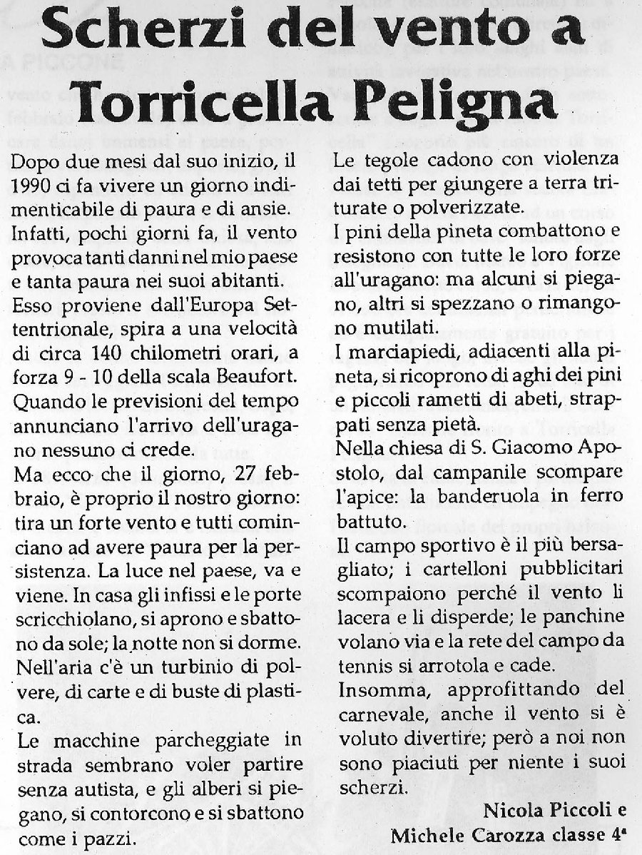 Pranks of the Wind in Torricella Peligna by Nicola Piccoli and Michele Carozza, Class 4. Two months after it began, 1990 made us live through an unforgettable day full of fear and anxiety. A few days ago the wind caused so much damage to my village and a great deal of fear amongst its inhabitants. It came from Northern Europe, blew at a speed of about 140 kilometres an hour, at force 9-10 on the Beaufort scale. When the weather forecast announces a hurricane, no one believes it. But here we are, the 27th February is really our day: a very strong wind is blowing and everyone begins to feel scared because it goes on and on. Lights in the village come and go. In the house the shutters and doors creak, opening and shutting on their own; no one sleeps that night. There is a whirlwind of dust in the air, with paper and plastic bags too. It looks as if cars parked on the roadside want to set off without any drivers and the trees twist and bend and bang like crazy. Tiles fall violently from the roofs reaching the earth ground down and pulverised. The Pine trees in the Pinewood fight the hurricane with all their strength; but some give way, others split or are left mutilated. The pavements near the Pinewood are covered with needles and small branches from the fir trees, torn off without mercy. In the Church of S. Giacomo Apostolo the top of the bell tower disappears: the wrought iron weathervane. The sports field is targeted the most; the publicity boards disappear because the wind tears them up and scatters them; the benches blow away and the tennis courts’ netting rolls up and falls down. So, taking advantage of it being Carnevale, even the wind wanted to have fun; but we did not like its jokes at all. Translation courtesy of Dr. Marion Apley Porreca