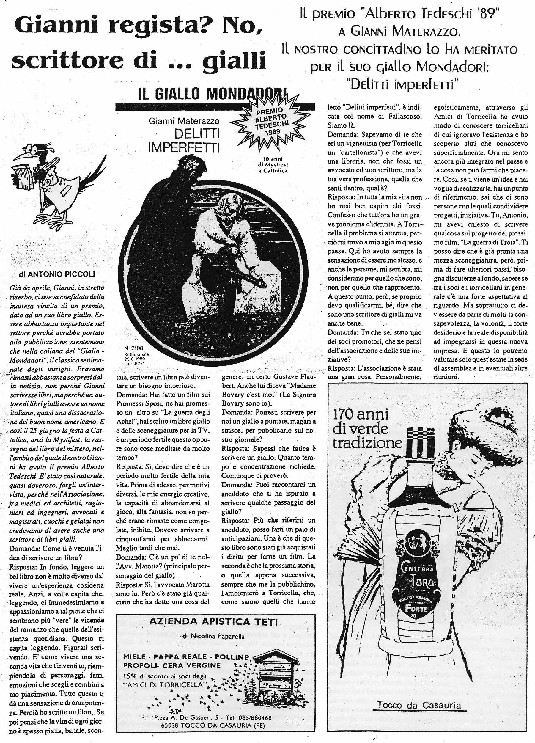 Already in April, Gianni confided in us in strict secrecy, that unexpectedly he had won a prize for his book, a thriller. It’s an important enough thing to get published in this sector, let alone by the Mondadori Thriller chain, the classical weekly of intrigue. We were very surprised at the news, not that Gianni is writing books, but that the writer of a thriller should have an Italian name, which is almost a desecration of good American names. And so on the 25th of June there was a festival in Cattolica[2], the “Mystfest”, the exhibition of mystery books, where our Gianni won the Alberto Tedsechi Prize. It was absolutely natural, almost his due, for us to interview him, because in our Association, between doctors and architects, accountants and engineers, lawyers and magistrates, cooks and ice cream makers, we didn’t believe that we also had an author of thrillers.