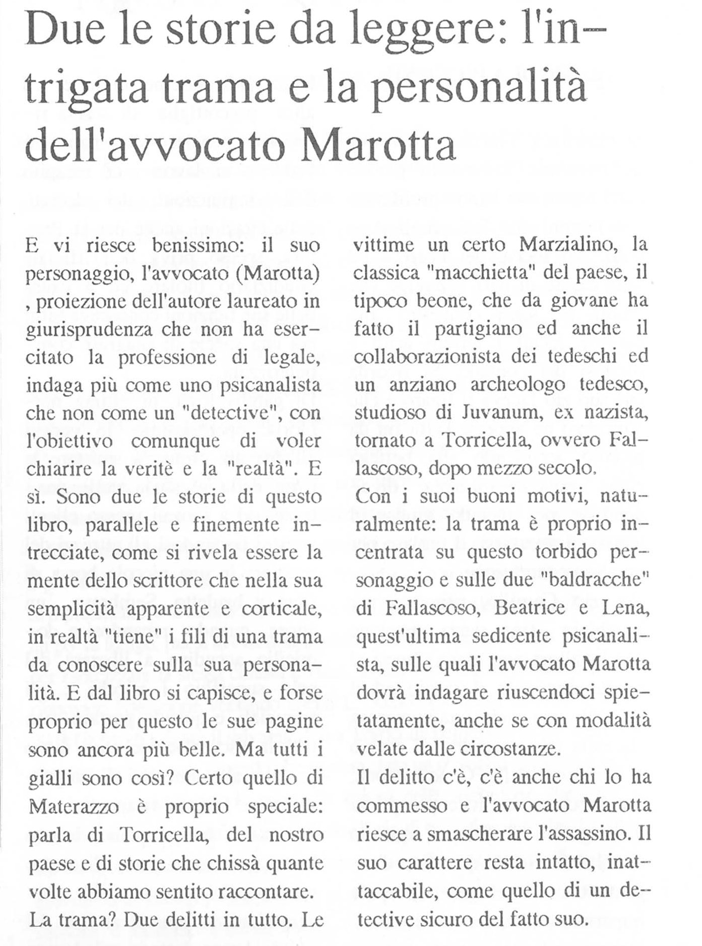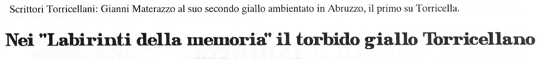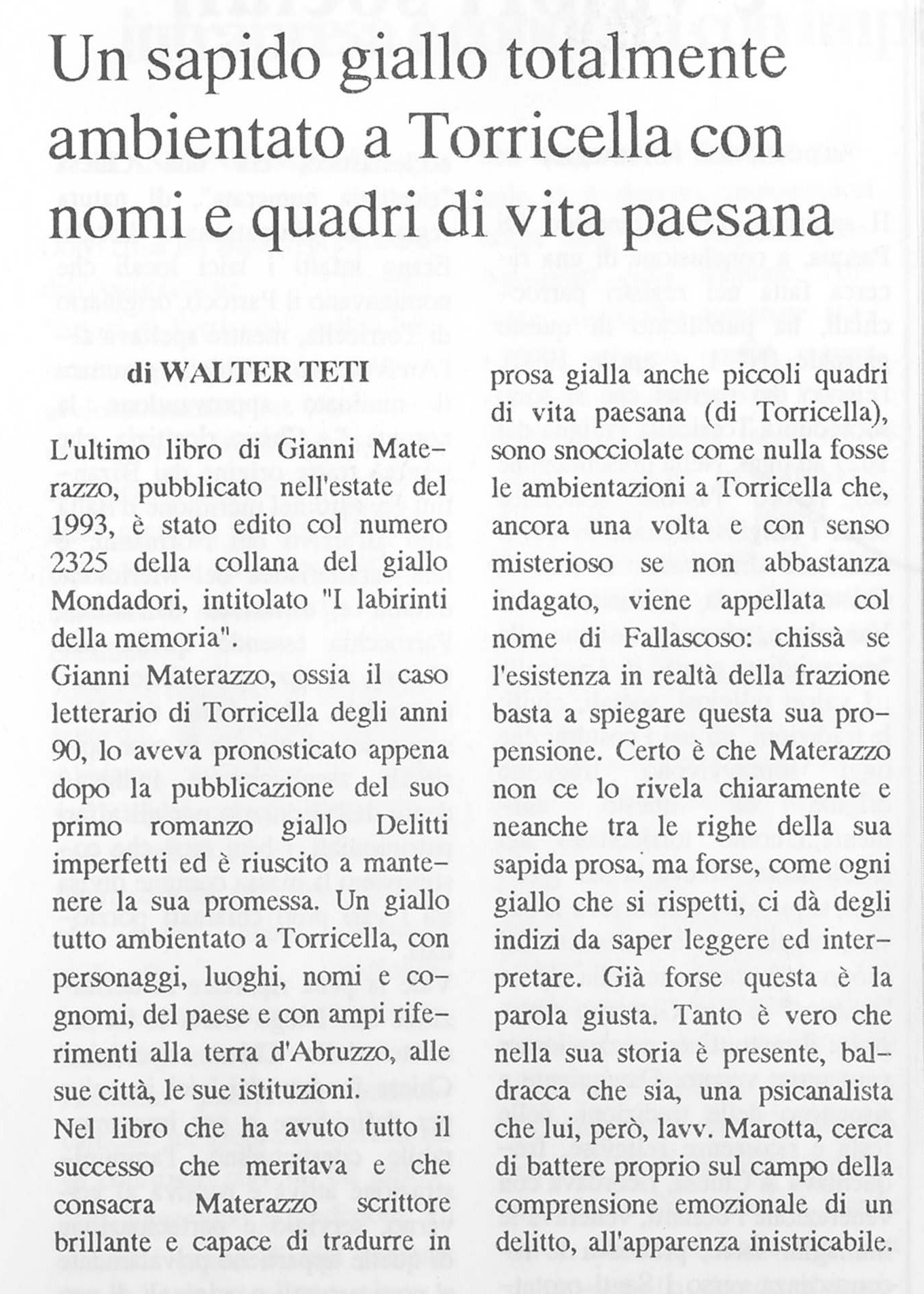 In the “Labyrinths of Memory” the Murky Torricellan Thriller A vivacious thriller totally set in Torricella with names and portraits of village life by Walter Teti. The latest book by Gianni Materazzo, published in the summer of 1993, was number 2325 in the Mondadori Thrillers chain of publications, entitled “I labirinti della memoria” (Labyrinths of Memory). Gianni Materazzo, or the scholar of Torricella since 1990, had predicted this book ever since his first thriller, “Delitti imperfetti” (Imperfect Crimes) was published, and he has succeeded in keeping his promise. A thriller set totally in Torricella, with characters, places, names and surnames from the village and with wide reference to the land of Abruzzo, its towns and its institutions.