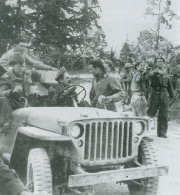 Domenico Troilo alla guida della jeep a colloquio con il tenente Mario Sciarra, vicecomandante della IV compagnia del capitano Mauro Filetti, schierata lungo la via Emilia il 20 aplile 1945 alle porte di Bologna. Sul mezzo a fianco del conducente c' è Gerardo Giovacchini e in piedi l'attendente di Troilo, il russo Aleksander Pesterlej detto "Shura". Domenico Troilo, at the wheel of the jeep, is talking to Lieutenant Mario Sciarra, Deputy Commandant of the IVth Company of Captain Mauro Filetti; they are lined up along the Via Emilia on 20th April 1945 at the entrance to Bologna. Gerardo Giovacchini is in the middle next to the driver and standing (at the rear) is Troilo’s attendant, the Russian Aleksander Pesterlej, known as “Shura”.