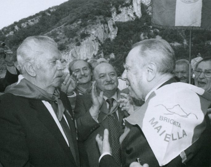Il presididente della Repubblica Carlo Azeglio Ciampi si intrattiente con Attilio Brunetti, ex caporal maggiore di fanteria, decorato dai polacchi con la medaglia Virtuti Miltari per aver ricondotto sulle spalle il suo sergente ferito fino alle proprie linee, e con la medaglia d'oro al valor militare italiana. Tra i due, il vicecomandante Domenico Troilo. Nello stesso giorno, il 17 maggio 2001, Ciampi rende omaggio a Taranta Peligna al sacrario dei caduti della Maiella. The President of the Republic, Carlo Azeglio Ciampi, engaging in conversation with Attilio Brunetti, ex Corporal Major of the Infantry, decorated by the Poles with the Medal of Military Honour for having carried his wounded Sergeant all the way to their own lines, and with the Italian Gold Medal for Military Honour. Between the two, is Deputy Commander Domenico Troilo. On the same day, 17th May 2001, Ciampi paid homage at Taranta Peligna in the Memorial Chapel for those from the Maiella who died (in the War). Photos and captions courtesy of : Translator’s Notes for the Photo Captions: [1] Domenico Troilo - fu il vicecomandante e "capo militare", in pratica l'uomo d'azione sul campo, della brigata fondata da Ettore Troilo, con cui condivideva solo il cognome senza esserne affatto parente, che fu il "comandante" perché fondatore e ideologo della formazione. [2] Domenico Troilo - was the Deputy Commandant and "Military Chief" of the Maiella Brigade that had been founded by Ettore Troilo. Practically speaking Domenico was the man of action on the field. They shared the same family name but were not related. Ettore was the "Commandant" because his was the ideology, he had founded the group.