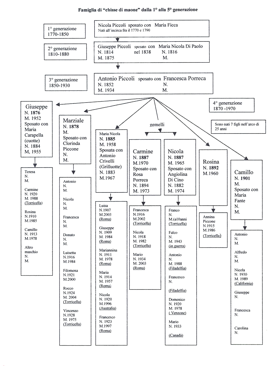 Note: E’ la famiglia più numerosa, otto figli. Le tre donne sposandosi hanno cambiato soprannome: Francesca di Campana che poi è il cognome del marito; Lusetta di vascianonne, Filomena di garofalo.