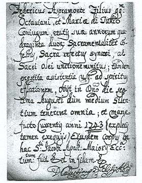 FEDERICO ASPROMONTE, son of Ottaviano and Maria di Julio, in his age of 42, after having confessed himself, after having received the Holy Communion and the Final Blessing, without lacking of spiritual assistance until the very end, rested in God on August 7 while "everything rested". When day came (in the current year of 1743), after performing the ceremonies, his body was buried in the church of San Giacomo Maggiore. In faith. Abbot Don Celestino -48- |