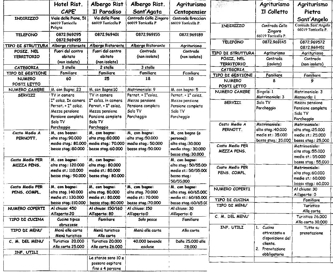 The following information sheet was received from the Torricella Visitors Center in 1999. Surely the rates may be out of date, so the chart is presented to provide other details of the facilities.