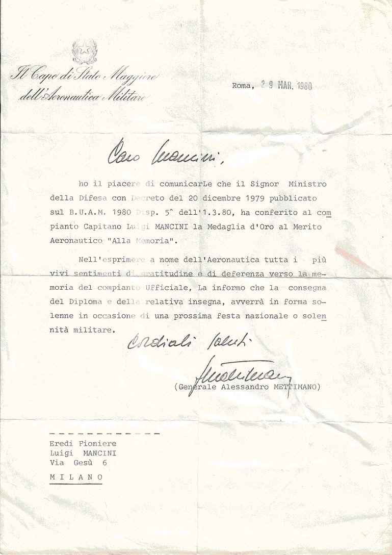 of the Military Air Force Dear Mancini, I have pleasure in informing you that with the Decree of 20th December 1979 published in the B.U.A.M.(Official Air Force Military Bulletin) 1980, Despatch No. 5 of 1st March 1980, the Minister of Defence has conferred on the late-lamented Captain Luigi Mancini the (posthumous) Gold Medal of Aeronautic Merit “in his memory”. In expressing in the name of the entire Airforce, the warmest feelings of gratitude and deference towards the memory of the late-lamented Officer, I wish to inform you that the award of the Diploma and relative badge (medal) will soon take place as a solemn ceremony on the occasion of a national holiday or a solemn military event. Warmest greetings, Translation courtesy of Dr. Marion Apley Porreca |