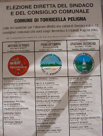 democratically without raising their tone. From what I heard, no one is sure about winning. On one end there is the "Democracy and Solidarity for Torricella" slate of Mayor Zacchigna, who has governed for the past 5 years. He completed certain projects, has placed others under contract, and has others in progress. He is asking for support to finish the agenda he began. The "Peace and Progress" slate of Piero Ottobrini was in the opposition during this latest administration. They feel the current mayor made only modest accomplishments during his tenure. They do not like the way he has handled public works contracts, and they say he lacks political support at the provincial and regional levels. This slate seems to have the largest spectrum of support with candidates and backers being important figures in present and past local political affairs. There are former heads of the Christian Democratic Party and the Democratic Party of the Left (PDS) and some from the Italian Social Movement (MSI; party on the right with some historical links to the fascist party). It also receives support from the former mayor, Davide Piccoli, and from the former vice-mayor, Antonio Di Sangro, who was dismissed from his position last October because of disputes with Mayor Zacchigna. "Together for Torricella" is the third slate headed by Antonio Di Renzo, It is supported by young Torricellans who have even started up a website: http://xoomer.virgilio.it/leapi/index.htm. The Piero Ottobrini group refused to list certain candidates, and so these people broke off to create this third slate. As the campaign moves ahead, they are increasingly convinced they can garner more than 200 votes. From what they say, if voters are fed up with old-style politics and decide to bet on their new approach, they could actually win. On Friday April 1st the electoral campaign will