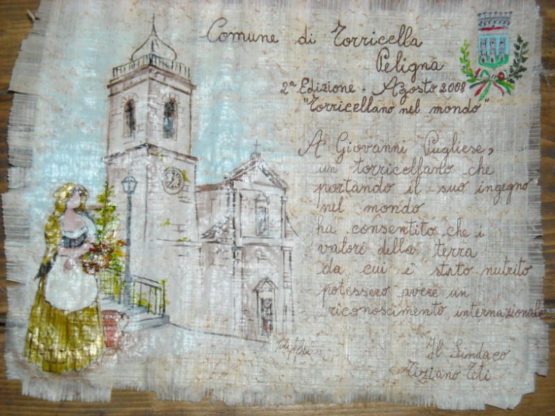 Torricellan in the World August 13th was the crowning event of the summer, the day dedicated to the Torricellan in the World – a wonderful celebration full of meaning. As you recall, the idea for this event arose from the Yahoo Group last year. Initially, a week dedicated to the Torricellans of the Word was planned, but then things got modified; the town administration took on the idea and made it into an award celebration. Last year’s winners were Albert Porreca and Dan Aspromonte, for reasons everyone knows. There was a huge celebration, and the winners were clearly very pleased. During the winter through the Yahoo Group, we decided that if the award is to be respected and honored, we needed to come up with rules and procedures; so we started the process of defining those rules and procedures. The town administration approved them and made them official. Each year the town administration will now gather to grant an award to one of its distinguished citizens. If a new administration wants to get rid of the award, they will have to present a motion to the town council and a majority will have to vote to cancel it. As Mayor Tiziano Teti explained in his speech at the award celebration, five conditions need to be met to be chosen “Torricellan in the World”: be alive; be born of Torricellan descent or be a resident of Torricella for a number of consecutive years; have done something notable in a professional, artistic, cultural or sport field; be nominated by May 30th via a short curriculum vitae of the nominee and reasons for the selection. Then, a commission is formed consisting of two council members from the majority party, two from the minority party and five other Torricellans chosen by the mayor together with previous winners of the award. The commission will meet for the first time by the end of June to choose a list of three finalists. Before the end of July the commission will meet again to choose among the 3 finalists. They will notify the winner in time so that he or she can be present for the award celebration in Torricella on August 13th. I thought I should summarize the award process because many asked how the winner, Gianni Pugliese, was chosen. Six nominations were sent to the town hall, Gianni together with five others. One of the nominees, unfortunately, did not meet one of the essential prerequisites; he had passed away. After a lengthy discussion and a secret vote, the commission selected Gianni by an ample margin. At noon on August 13th, in the hall of the town council, elegantly adorned with the artwork of Guglielmo Coladonato, the mayor stood in his official uniform between the vice-mayor and the councilman for tourism and in front of a full audience of Torricellans. Gianni Pugliese, 52 years old, born in Rome but of a Torricellan family, electronic engineer and inventor for his company Telecom & Security in Chieti Scalo, entered the hall welcomed by a very warm applause. He was honored with the award because he has received Italian and world recognition for his “CaP” invention, a connector for coaxial cables. As he explained, it is a simple yet innovative little device; he has managed to clobber his American and Japanese competitors in the same field. Gianni’s company now gives work to many young researchers. The ceremony was very solemn, and at the same time very touching. Gianni had to stop several times because he was so moved. He was sincerely appreciative. He had prepared a speech, but he had trouble reading it because he got so emotional. As he said, this award means much more to him than awards given to him in America. At the end of the ceremony, the mayor gave him a silver tower made by Pasquale Imbastaro, a Torricellan jeweler, and a beautiful parchment designed by Paola Di Biase, an artist from Chieti who is “nearly” Torricellan. On the parchment there was a dedication written by Gabrielle Porreca: To Gianni Pugliese, a Torricellan that has taken his ingenuity to the rest of the world. His homeland nourished him with certain values, and these values have now received international recognition. After the ceremony we all went to the small pine grove next to the Church of the Alpine Guard. It is a magnificent place with a full circular panorama. The Torricellan Alpine Guard Association kindly offered the locale for the event (this association cannot be thanked enough; they do so much for the town), together with tables, benches and the helping hand of Marziale D’Ulisse, the president of the association. Marziale then entertained those who attended the luncheon (more than 80) singing Torricellan songs in his inimitable style, together with the backing of many of the attendees and the accompaniment of Giose Di Fabrizio on the accordion and Gianni Testa on the guitar. It was a fantastic afternoon. It was cool under the shade of the pine grove. When I hear songs such as “Paese me” and Quann’ariscalla l’aria a San Vincenze”, I recall many open-air feasts of the past and those that were dear to us, but have passed on……but let’s go on to something else. The lunch was prepared by the Hotel Paradiso: rigatoni with chicken ragu, chicken with potatoes and salad, watermelon, ample amounts of wine, and an exceptional fiadone that was devoured. They had to bring four more fiadoni because the 90 pieces or so that they brought initially were not enough. It was fresh, moist, sweet and thick. You have to admit, Vincenzo Di Cino, the owner of the Hotel Paradiso, makes the best fiadone around!! During the ceremony and the luncheon, some said it would be nice to organize a day to remember those who passed away, and in particular, music composers were mentioned such as Roberto Porreca and Alfredo Piccone. An event dedicated to the operas of Vincenzo Bellini senior was also mentioned as well as a concert dedicated to the music of Vincent Persichetti, an illustrious American composer and son of a Torricellan. In fact, during the ceremony it was an