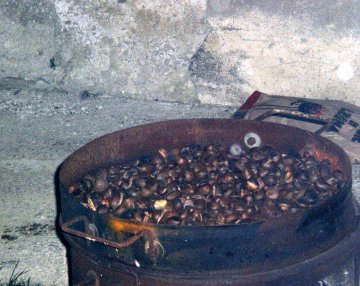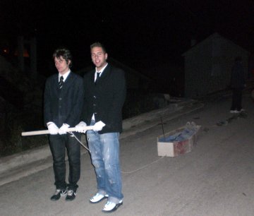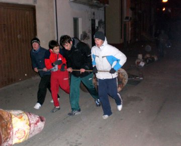 (the boy), Finally, after numerous turns around the village’s streets by the various groups of youths, followed by a large number of citizens who braved the cold wind, the “cioccoli” were politely thrown into the dustbin lorries and then everyone went towards the Museum, where enormous platters of chestnuts had been prepared accompanied by abundant quantities of new wine together with bruschette, cheese and sausages which were eaten in the large hall of the Museum. Prizes were given to the most original group (there were two boys dressed as grave-diggers who pulled a coffin!), for the noisiest and various others, and this all went on until very late. I am attaching several photos, which although not terribly clear, give a better idea than nothing at all!