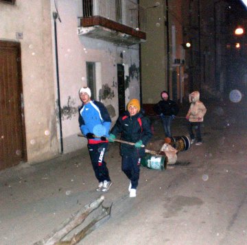 In addition, there was a large crowd, at least 200 people followed from start to finish, applauding right up to the final phase at the roundabout. It seemed as if it were one of those summer evenings, even though it was bitterly cold. The sky was clear but there was a north wind that bit your ears off. At the end of the parade, the Administration invited everyone to the Nursery School hall, for the prize giving, it was a lovely large and welcoming room, where other boys and girls had prepared roast chestnuts, new wine, sausages and “bruschette” (toasted bread covered with olive oil, garlic and tomatoes), without sparing the cost. The team classified as the most creative won a leg of ham, the noisiest one won a live cockerel, and two 50 Euro vouchers were given to the youngest and the oldest teams. To complete the news, the ham quite justly was given to both the team of Fausto Teti, Daniele D’Ulisse and Mario Di Luzio, and to that of Eliano Ficca and Piero Rossi; the live cockerel went to the team of Nicola Di Francesco, Mattia Ficca, Domenico Ottobrini and Giovanni D’Amico; the 50 Euro vouchers went to Giorgia Teti and Benedetta Di Falco as the youngest and to Michele Gentile, Antonio Di Luzio and Francesco Ficca as the oldest. When I think about that deafening noise that filled the silence of the night, getting louder and louder, then slowly drifting away again, I recall how fantastic it was. Definitely an excellent rediscovery, one to be worked on to make it an annual appointment. Maybe with some adjustments, for example organising in various parts of the village corners from which to offer roast chestnuts and wine. Not at the school like this year, but in four or five more characteristic places: at the Calacroce neighbourhood, the Coste, on the Corso, and at Saint Antonio’s. It would really be a great Festa that would attract ever so many guests from the entire region. It would be an original celebration, captivating and fantastic. An occasion not to be missed.
