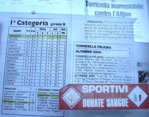 The Sports Association is proud not only of the first team, now they have a team in four other categories, “Pulcini”, under 11 years old, “Esordienti“, under 13, “Allievi”, under 17, and “Primavera”, between 15 and 20, and they are all doing well. The President related with pride that on Sunday 4th November, the “Pulcini” won against San Vito by 13 - 0, the “Allievi” won against Frisa by 2 – 1, and Torricella won against l’Altinese by 3 – 0. We should recognise that in recent years, but especially last summer, the lower categories have undergone annexation: the Sports Clubs of Torricella, Gessopalena and Montenerodomo have joined together, creating a single, large football school. A movement has thus been created which will bring great benefit to all three villages, to all the children who play sports at “home” and to all the parents who can easily follow their children involved in this sport.