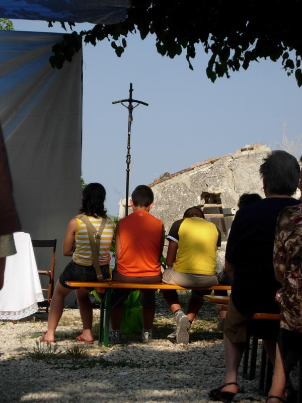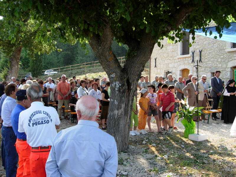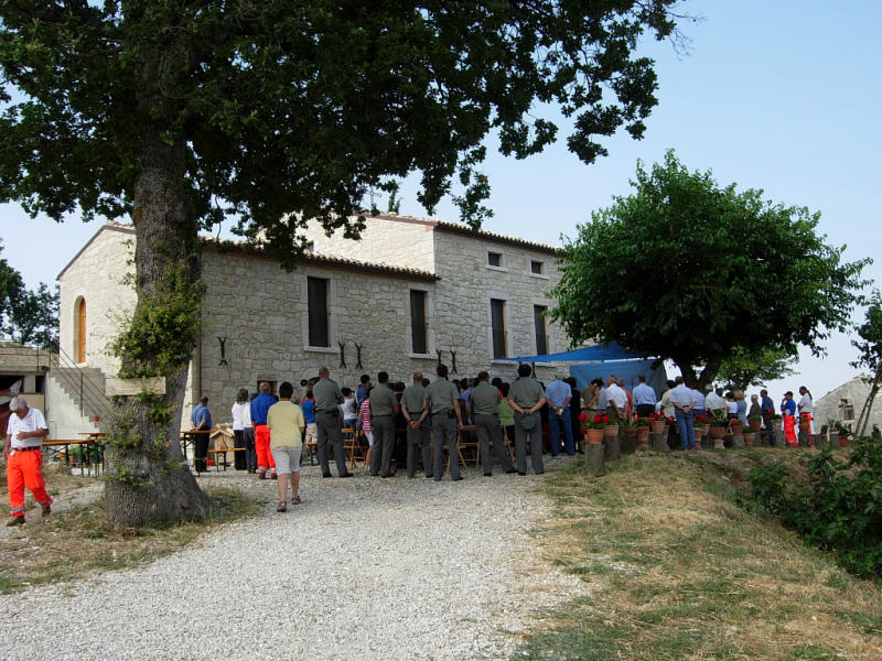 Sono giunto al monastero di Don Giustino alle 17.10; la celebrazione religiosa era appena iniziata. Il cielo era limpido e faceva molto caldo. Le persone presenti si erano messe quasi tutte sul lato destro dello spazio preparato davanti al monastero, il lato ombreggiato da grossi alberi, mentre il lato sinistro esposto al sole era occupato dagli uomini della forestale e dalle autorità. Durante la celebrazione religiosa veniva spontaneo volgere lo sguardo al paesaggio circostante, al cielo azzurro e alla natura incontaminata, al volo degli uccelli e a quel profumo unico dei boschi. Don Giustino e Suor Lidia hanno accolto i partecipanti alla celebrazione con quell'amore che dovrebbe contraddistinguere ogni essere umano. Dopo la celebrazione della messa siamo stati tutti invitati a partecipare al rinfresco da loro organizzato, panini, rustici, dolci, bevande e quei buonissimi panini alla tresca* tipici di Torricella. Una bella giornata dedicata alla natura e a quegli uomini che con il loro lavoro cercano di tutelarla e difenderla dall'assalto insulto dell'uomo irrispettoso e autodistruttivo.