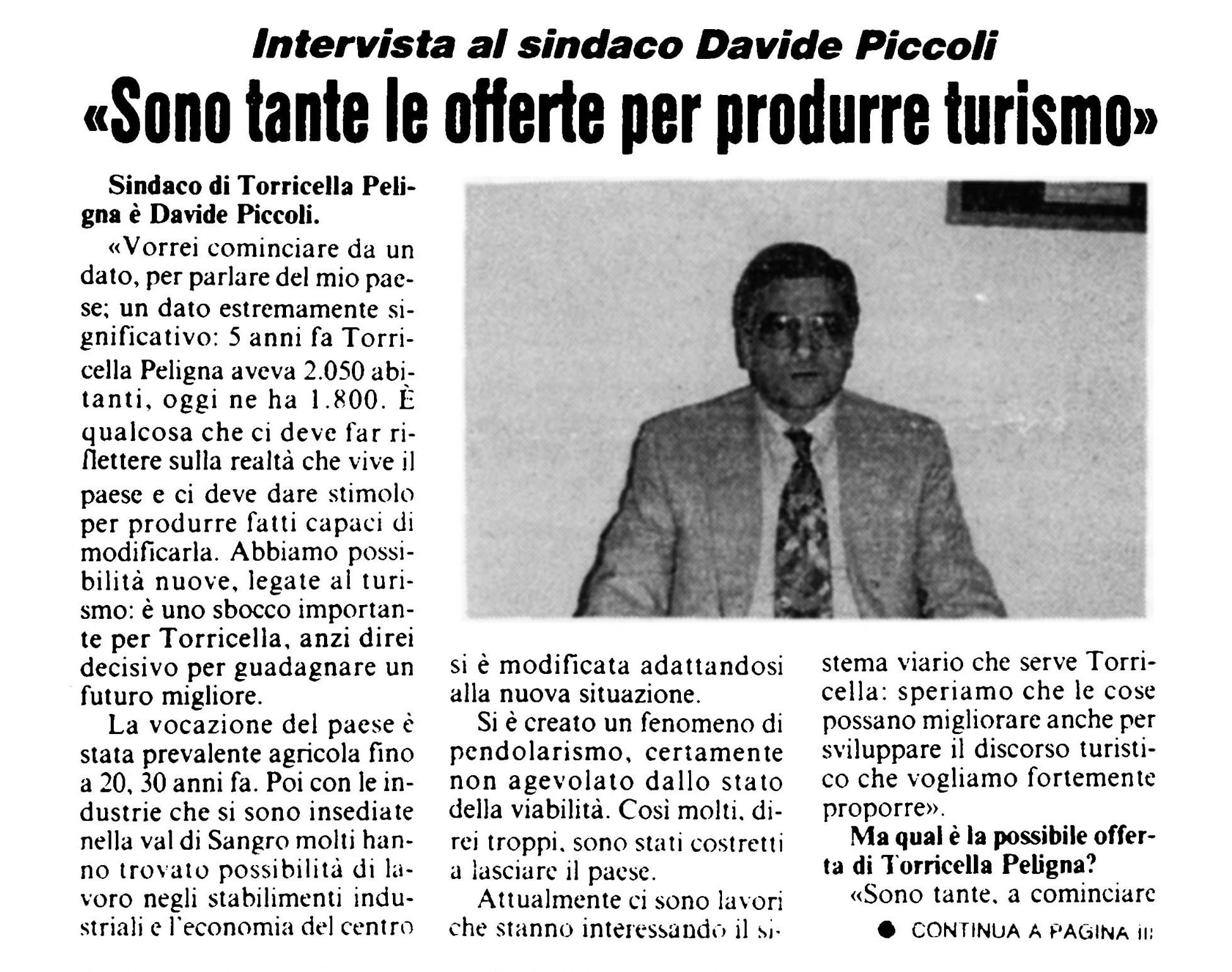 (1994) Mayor of Torricella Peligna is Davide Piccoli. Until 20 or 30 years ago the village tended to be chiefly agricultural. Then, as factories began to be set up within the Sangro valley, many people were able to find a position in these industrial works and so the economy of our centre changed as it adapted to the new situation. The commuter phenomenon arose but was hindered by the poor road network. Thus many people, I would say far too many, were forced to leave our village. Currently work is being carried out on the roads leading to Torricella: let’s hope that things will improve sufficiently for us also to be able to develop the tourism that we so strongly wish to offer.” But