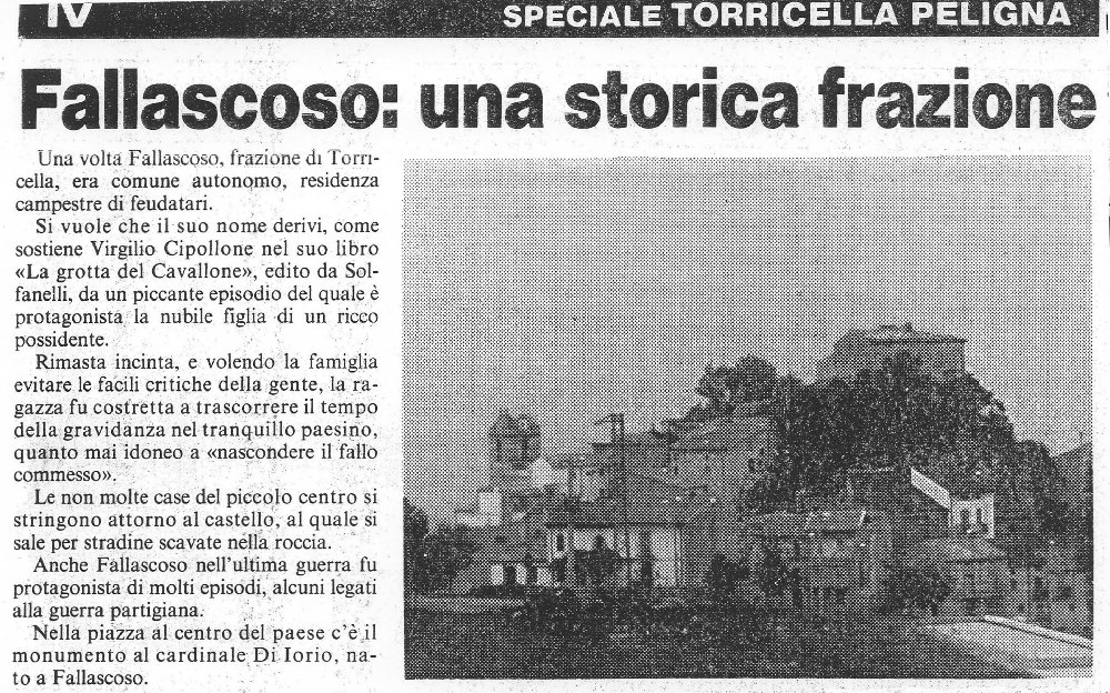 Once Fallascoso, an outlying hamlet or suburb of Torricella was an autonomous commune, the countryside residence of the feudal Lords of the zone. It is thought that its name is derived from a spicy episode, the protagonist of which was the nubile (marriageable) daughter of a rich landowner, as is described by Virgilio Cipollone in his book “La grotta del Cavallone” published by Solfanelli. She became pregnant and her family, wanting to avoid people’s criticism, forced the girl to hide for the duration of her pregnancy in this quiet little hamlet, highly suited to hiding the “fallo” (mistake) she had committed. The few houses of this small centre are snuggled close to the castle, to which the little pathways carved in the rock all lead. Fallascoso was the scene of many episodes during the War including some involving the partisans. In the square at the centre of the hamlet is a monument to Cardinal Di Iorio, who was born in Fallascoso. From the