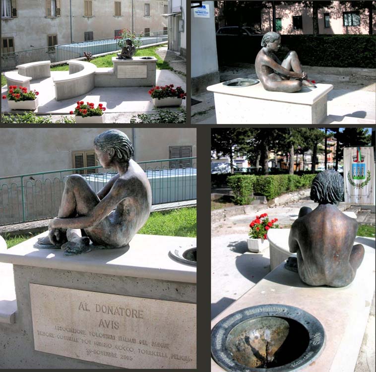 The AVIS (Italian Association of Blood Volunteers) Monument On November 20th 2005 the monument was inaugurated. It is next to the Town Hall. The project was thought up by Elio Garis, an artist from Cuneo, who is married to Rita Carapella from Torricella. He forged a statue in bronze, the focal point of the monument. The statue depicts a girl who metaphorically is life, that which the blood donor gives to others. On one side of the monument there is some writing that recalls Don Ignazio Cocco, the founder of the section. The AVIS section is certainly something of which Torricella can be proud. A village with so few inhabitants has countless donors. |